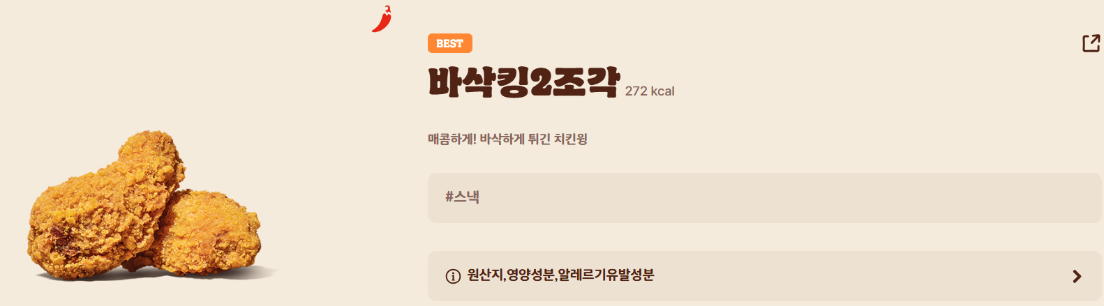- 바삭킹 (2조각): 매콤한 맛을 선호하는 분들께 강