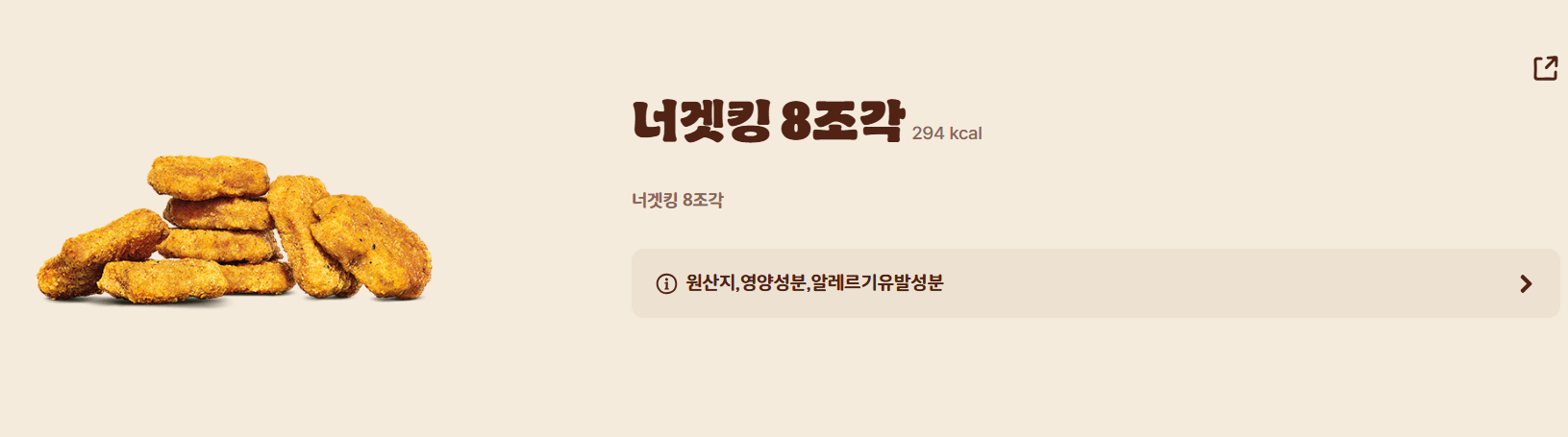 - 너겟킹 (8조각): 부드럽고 담백한 치킨 너겟