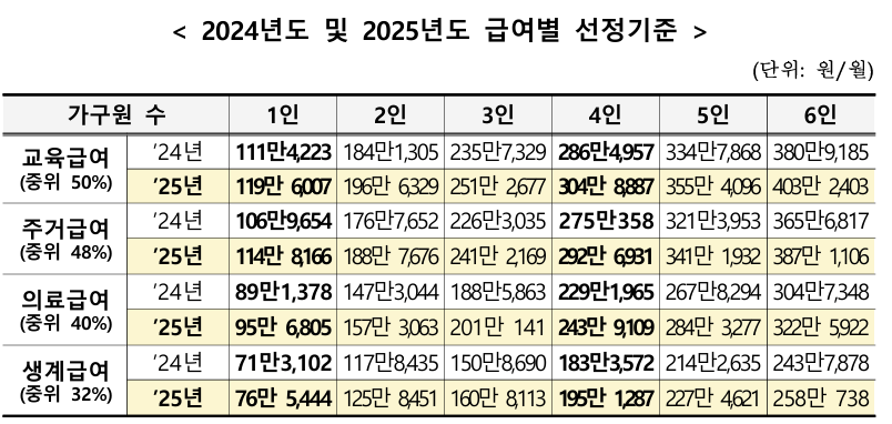 - 2025년 기준 중위소득 6.42% 인상으로 더 많은 가구가 생계급여를 받을 수 있음