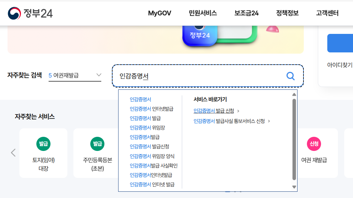 - 상단 검색창에 "인감증명서" 입력